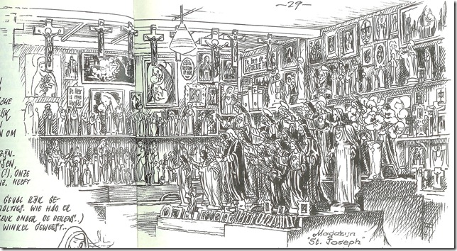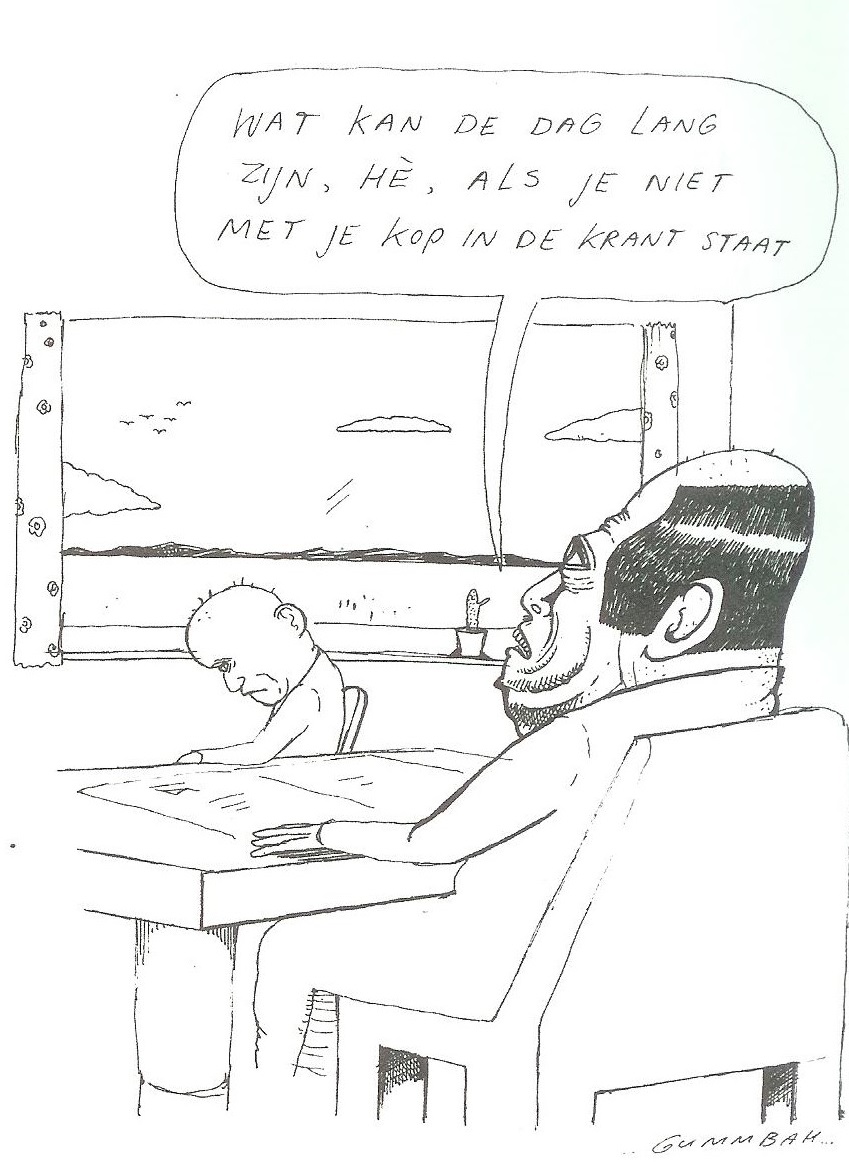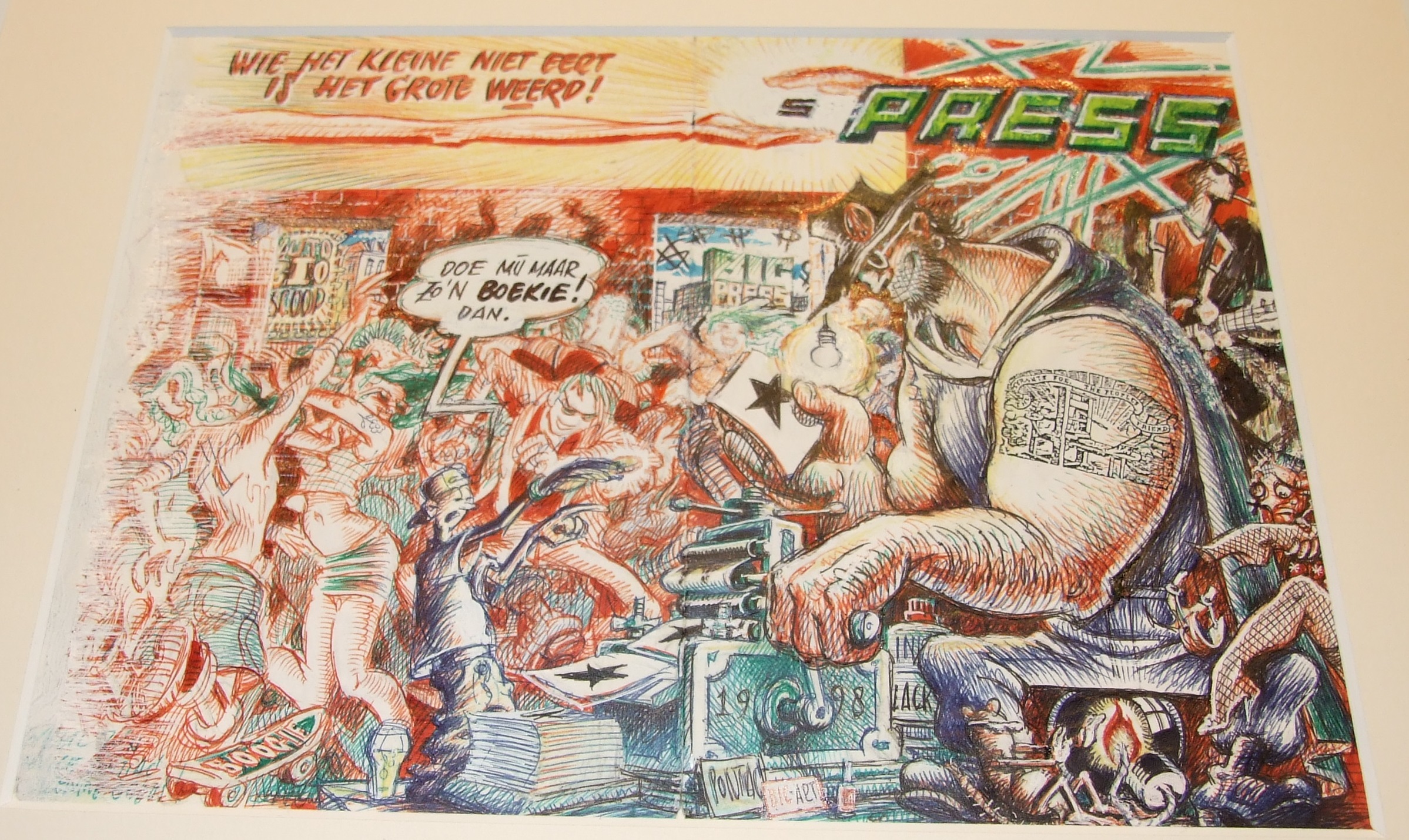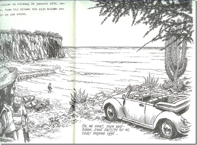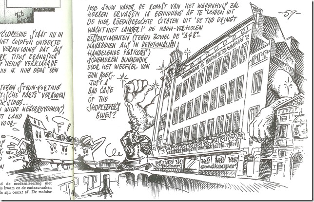 Dat de pagina’s geheel gevuld zijn met teksten en tekeningen droeg bij aan mijn kooplust. In interviews geeft de tekenaar/auteur hier verschillende verklaringen voor. De wat mij betreft mooiste vond ik in een interview uit 2001 in de NRC: “Dat ik mijn tekeningen volstop heeft er ook mee te maken, dat ik in mijn tekeningen woon als ik eraan werk, en dan wil ik er ook zo lang mogelijk in blijven wonen. Als ik er dan nog iets bij weet te verzinnen, garandeert dat een langer verblijf.” Die ervaring deel ik met de auteur, maar dan van de consumentzijde zeg maar.