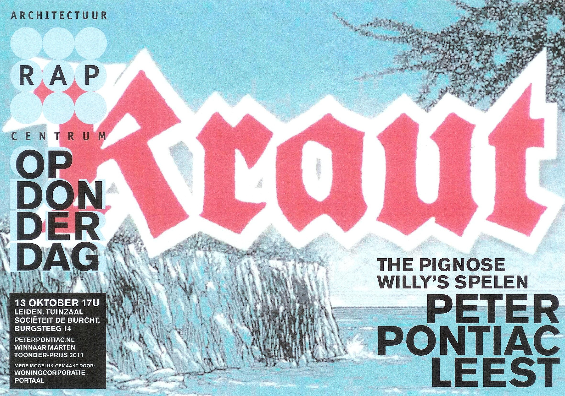 In 2011 heb ik voor RAP Architectuurcentrum Peter Pontiac uitgenodigd om voor te lezen uit Kraut. De gebeurtenis vond plaats op 13 oktober van dat jaar in de Tuinzaal van Sociëteit de Burcht.